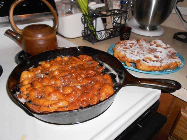 -Preheat oil in a cast iron skillet on medium high heat (for an electric frying pan preheat to 375 degrees). Leave room between the oil and the top of the pan to allow room for batter to be added. Beat eggs, add milk and sugar. Beat well. In a separate bowl, sift flour, salt and baking powder. Add to egg and milk mixture. Beat until batter is smooth. Batter should be thin enough to flow through the opening of your funnel. If needed, add a little more milk.